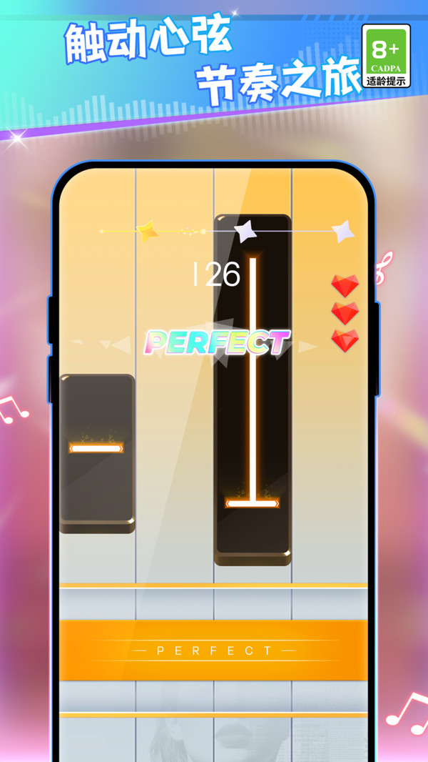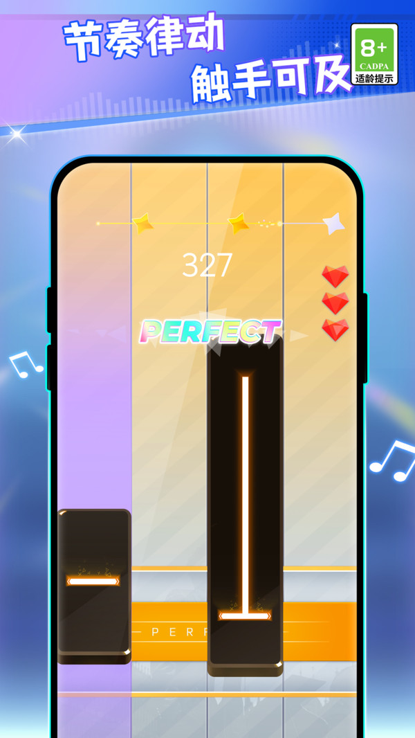 3、有的长音符需要你一直长按才可以让节奏更加完美,获得高分,继续玩耍。
